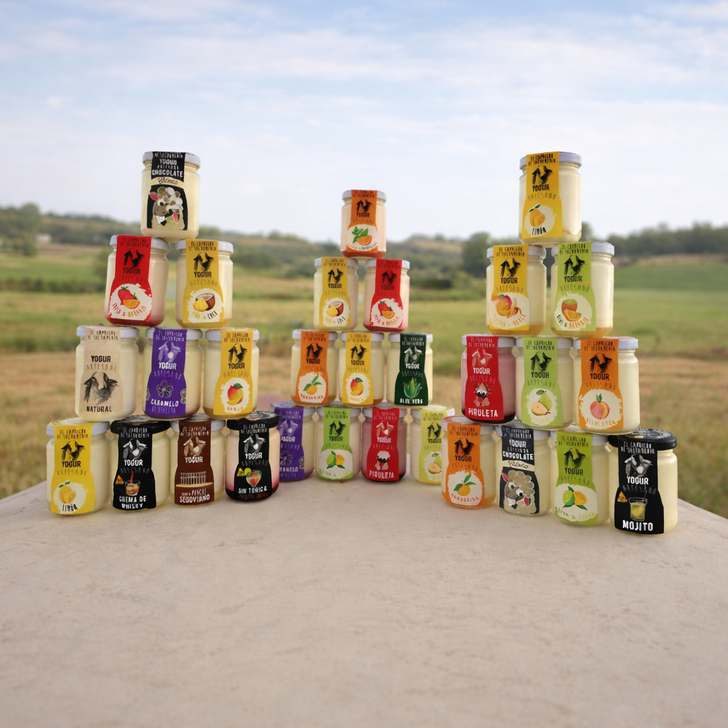 Nuestros yogures artesanales de leche de oveja están disponibles en los sabores: natural, mandarina, limón, kiwi con naranja, mango, aloe vera, fresa naranja, melocotón, piña y coco, lima limón, naranja hierba buena, caramelo de violeta, gin tonic con frutos rojos, mojito, crema de whisky, chocolate blanco, pera, plátano con mango, piruleta y ponche segoviano.